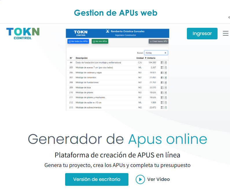 TOKN es una plataforma de generación de Análisis de Precios Unitarios (APU) y estudio de costos de obras de todo tipo